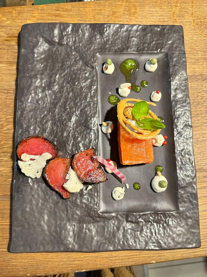 La truite fumée maison, crème de wasabi et betteraves Chioggia rôties